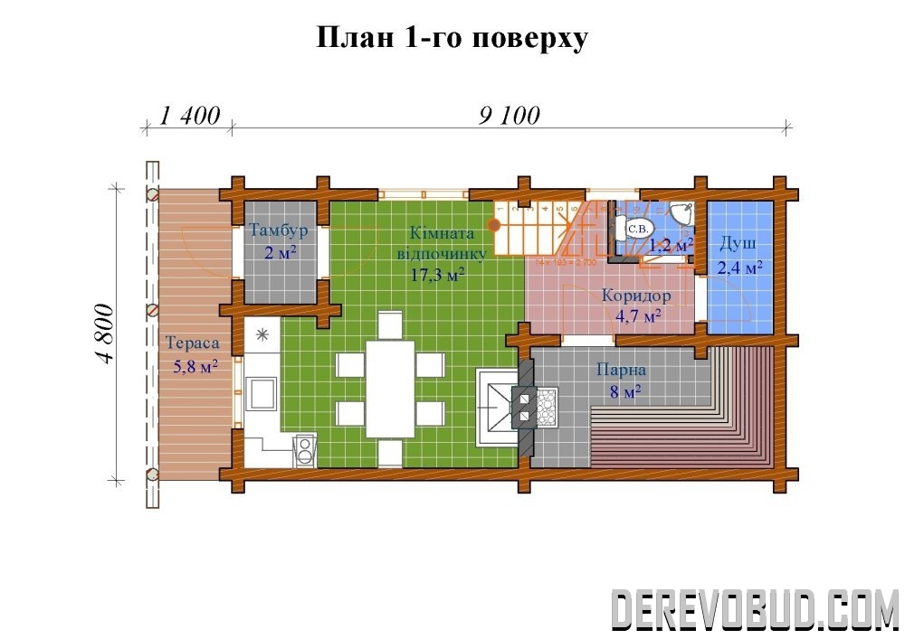 35,60 м2 - 1 поверх+5,80 тераса = 41,40