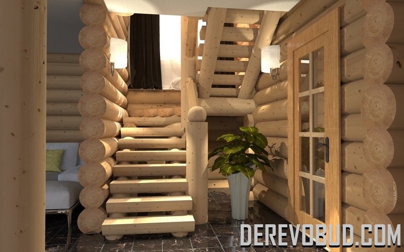 Оформление загородного деревянного домаСходи зазвичай займають центральне місце в заміському інтер'єрі. Під ними можна встановити місткі полиці, висувні ящики або створити невелику комору для різного господарського начиння. Всі інженерні системи краще приховати в стінних каналах або під чорновою підлогою. У заміському дерев'яному будинку важливим моментом є прокладання електричних кабелів. Попередньо зробіть макет розташування розеток, щоб потім було зручно їх використовувати.