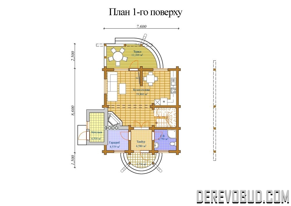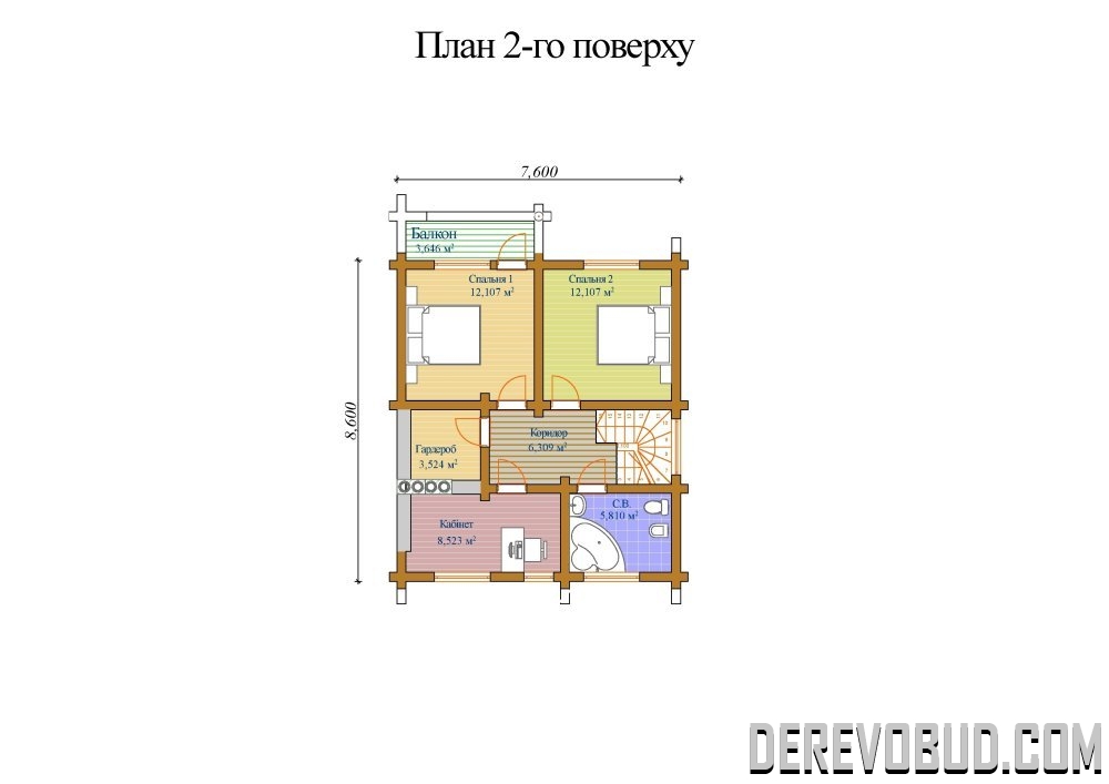 Будинок 129,936 кв.м Оциліндрований брус - 220 мм. 7,6 х 8,6 м 77,910 м2 - 1 поверх 52,026 м2 - 2 поверх 129,936 м2 загальна площа