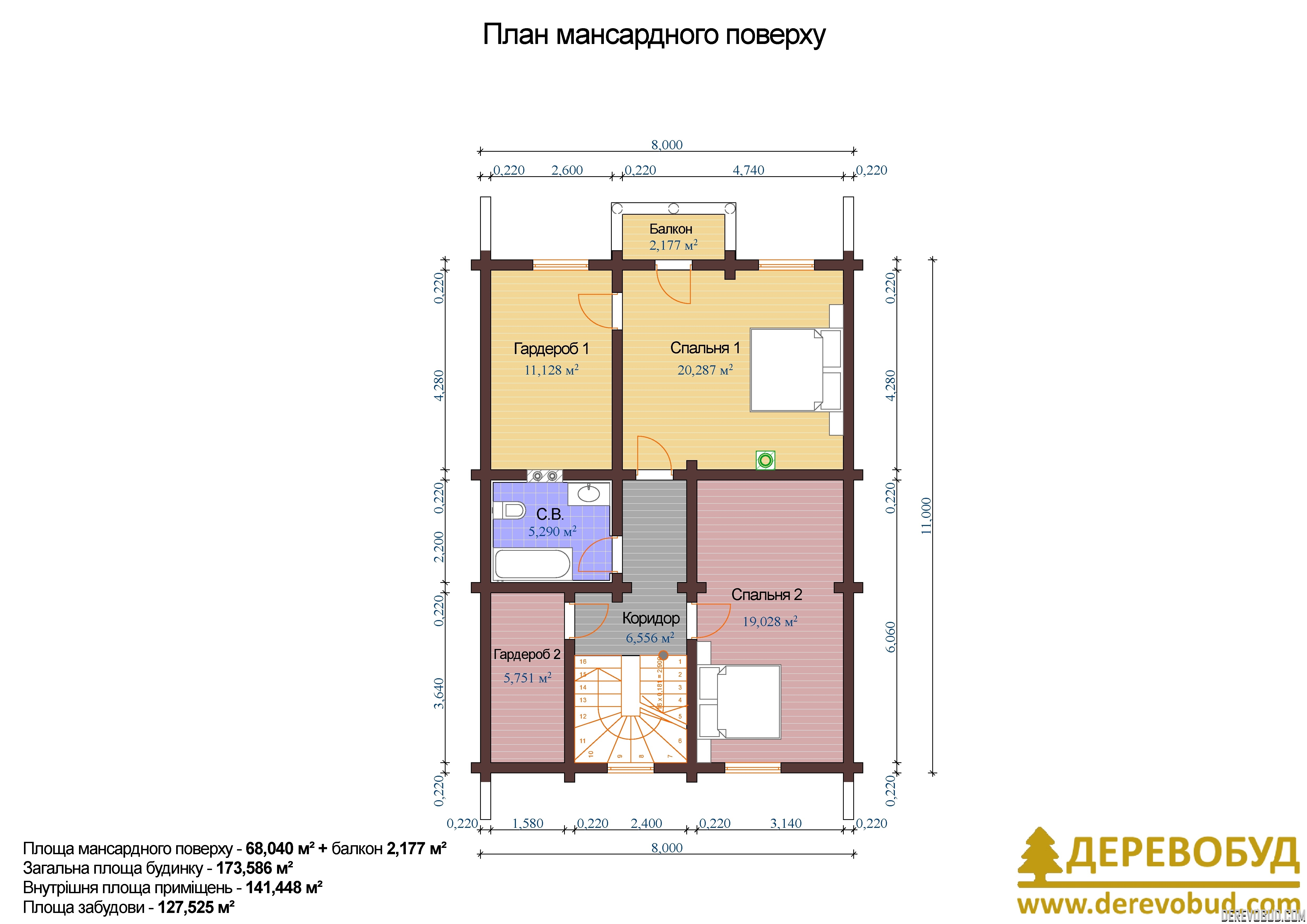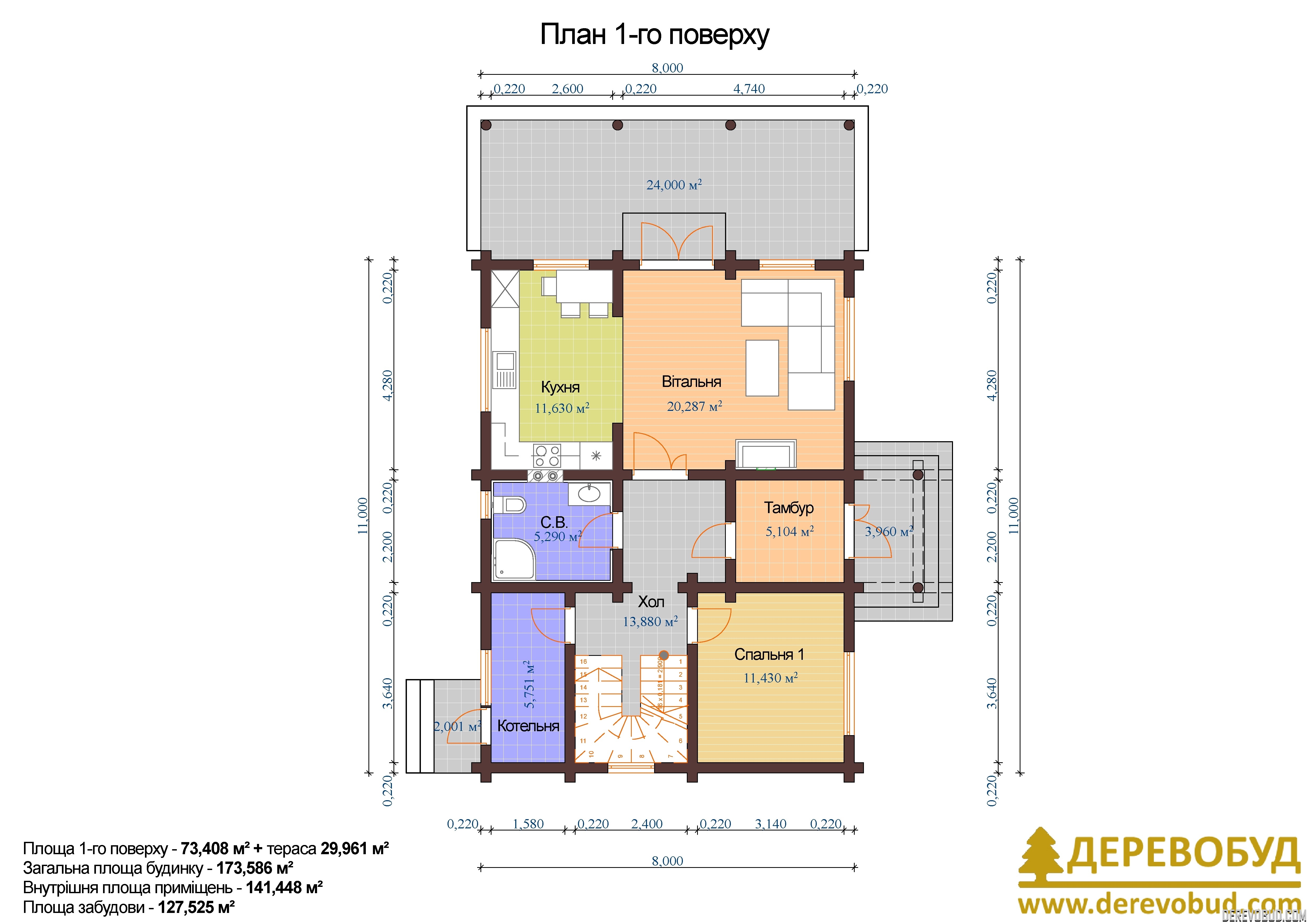 Будинок 173,58 кв.м. Будинок 8 × 11 м. 73,40 м. + тераса 29,96 м. - 1 поверх 68,04 м. + балкон 2,17 м. - 2 поверх 173,58 кв.м загальна площа