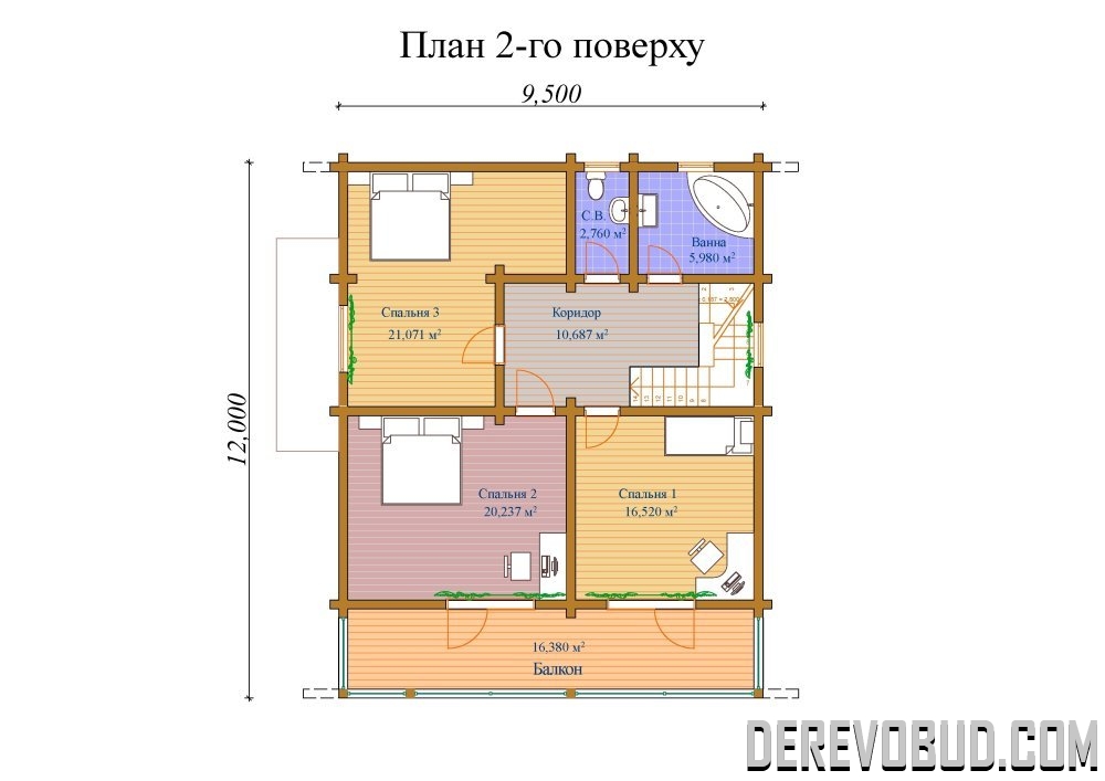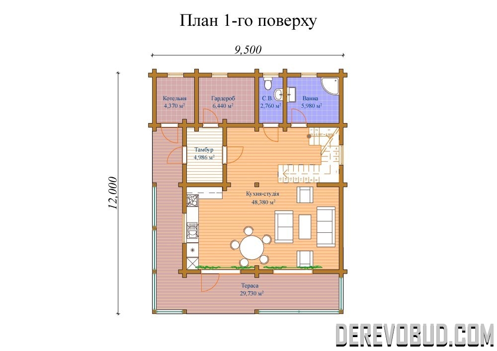 Будинок 196,281 кв.м Брус 200х185 мм. 12 х 9,5 м 102,646 м2 - 1 поверх 93,635 м2 - 2 поверх 196,281 м2 загальна площа