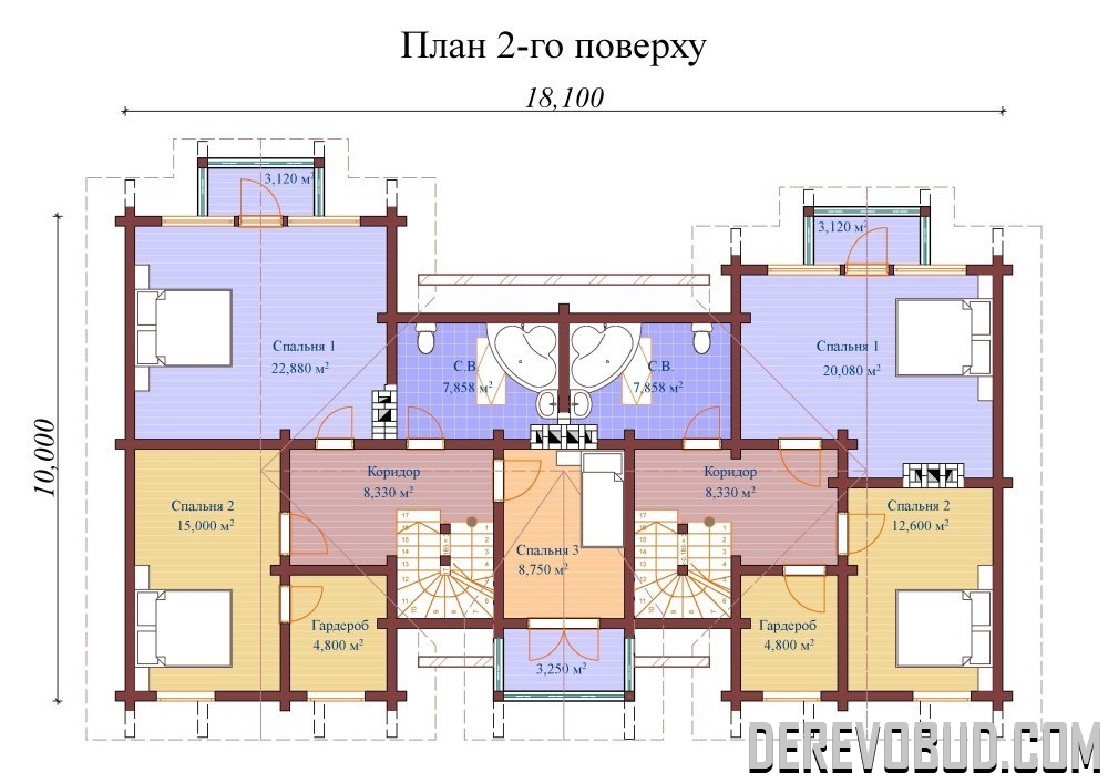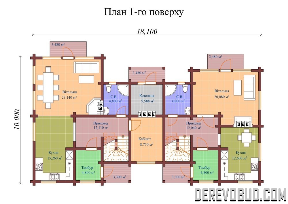 Будинок 273,104 кв.м Брус 200х185 мм. 18,1 х 10 м 142,328 м2 - 1 поверх 130,776 м2 - 2 поверх 273,104 м2 загальна площа
