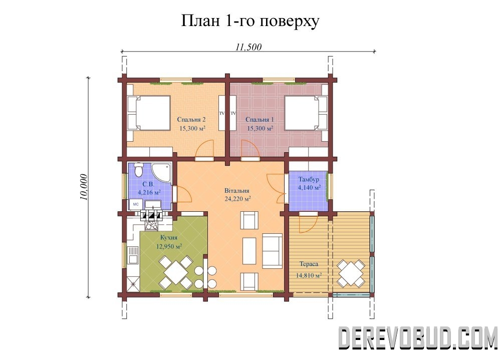 Будинок 90,936 кв.м Брус 200х185 мм. 10 х 11,5 м 76,124 м2 - 1 поверх 14,810 м2 - тераса 90,936 м2 загальна площа