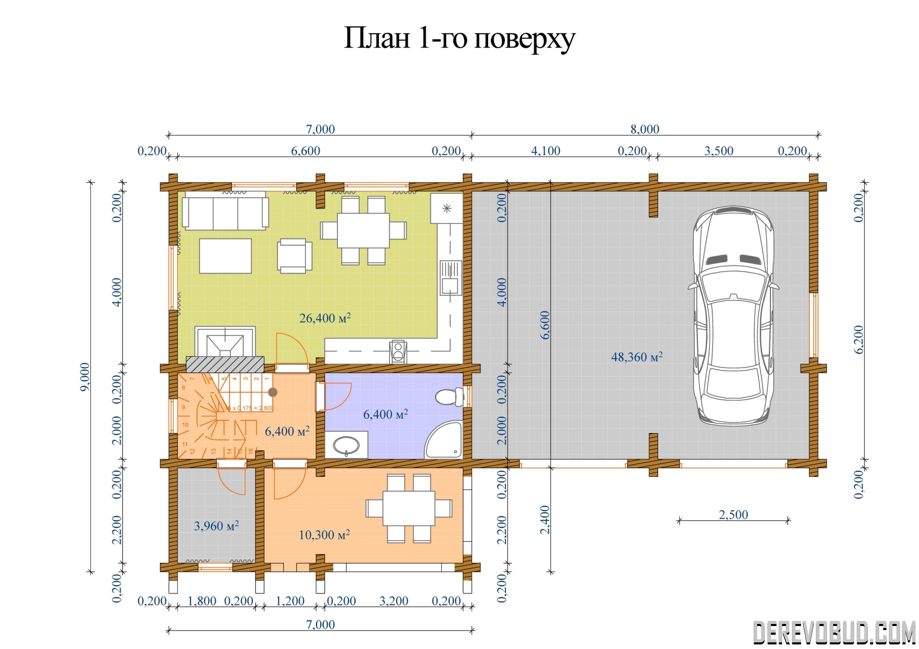 Будинок 93,97 кв.м. Будинок 7 × 9 м. Гараж 8 × 6,6 м. 53,46 м. - 1 поверх 40,51 м. - 2 поверх 93,97 кв.м загальна площа