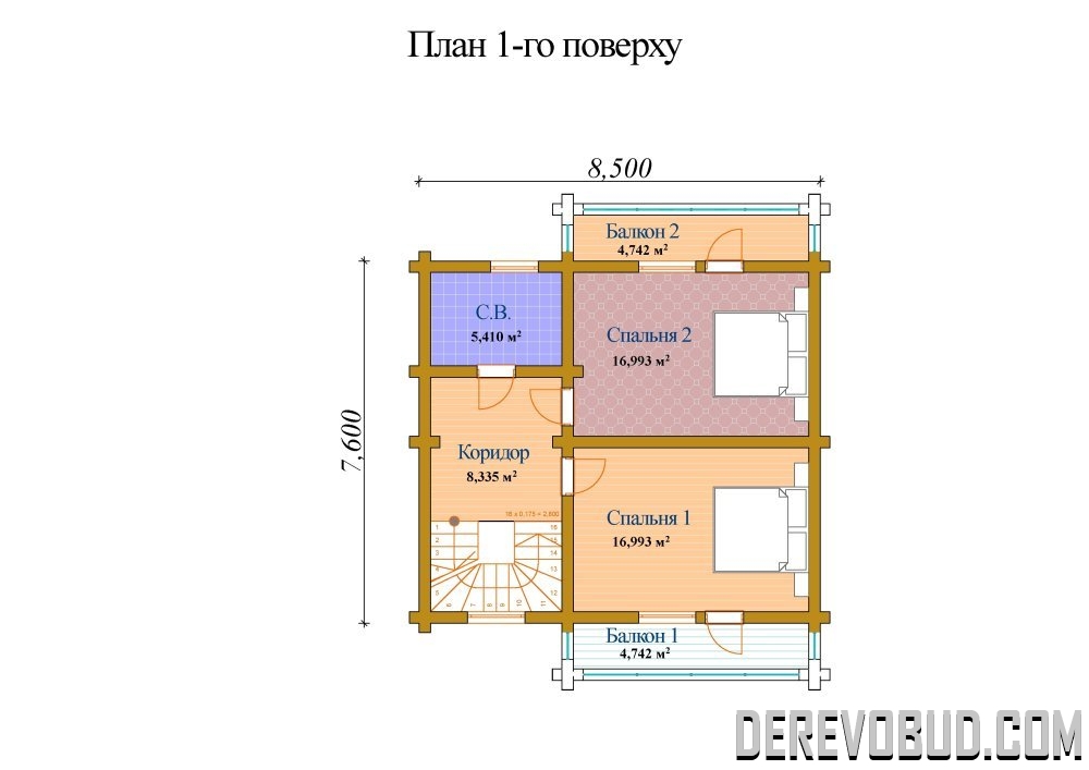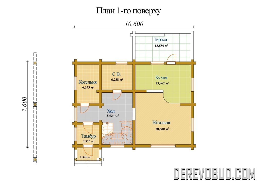 House 114,293 sq.m Rounded timber - 240 mm. 10.6 x 7.6 m 66.562 sq.m. - 1st floor 47,731 sq.m. - 2nd floor 114,293 sq.m. total area