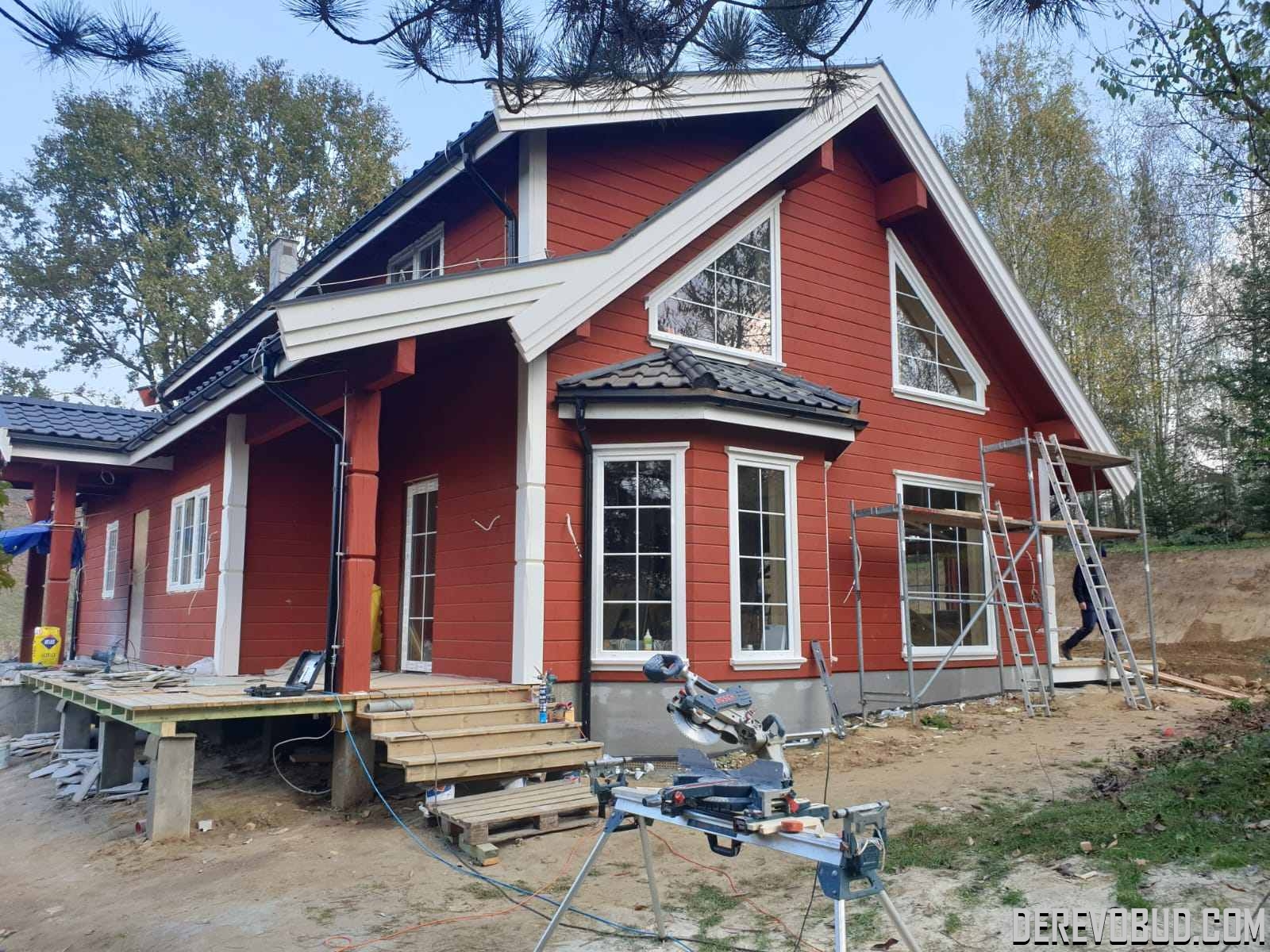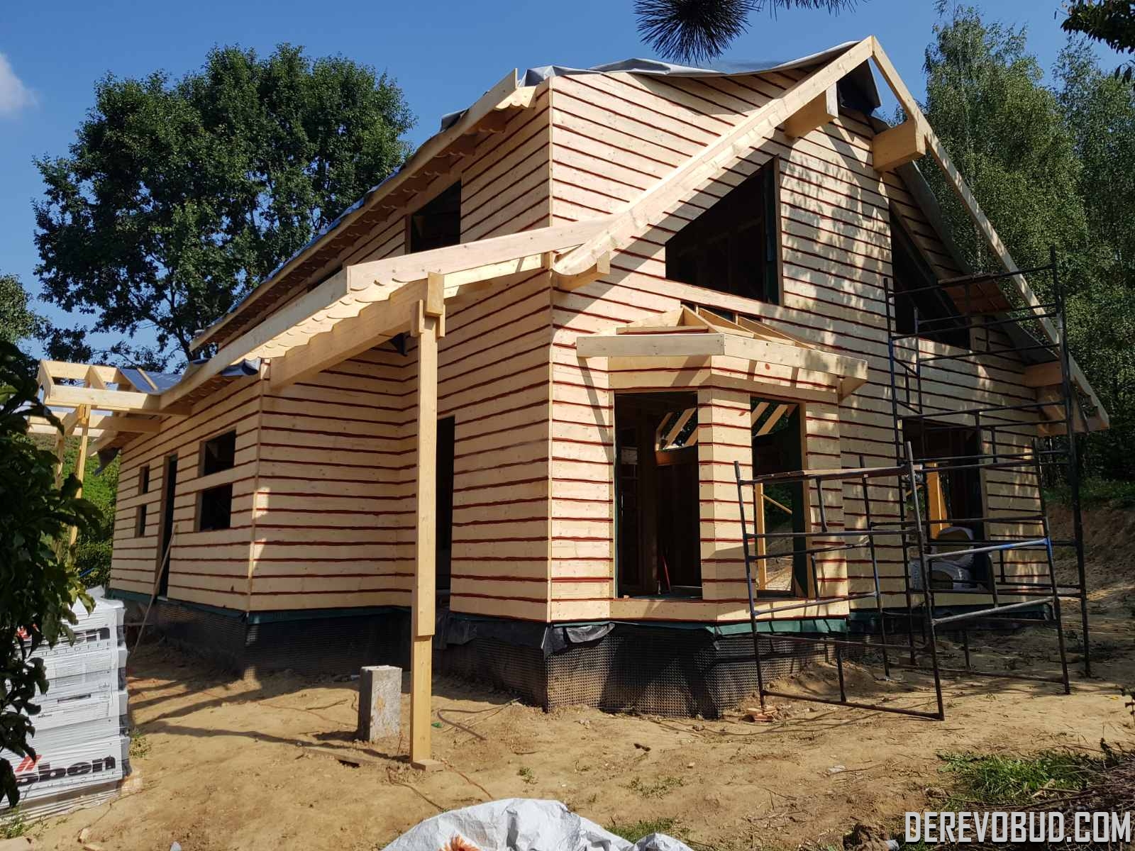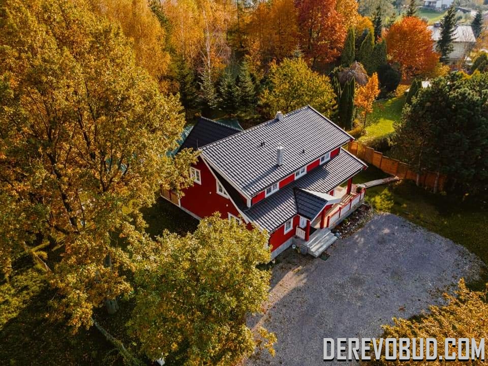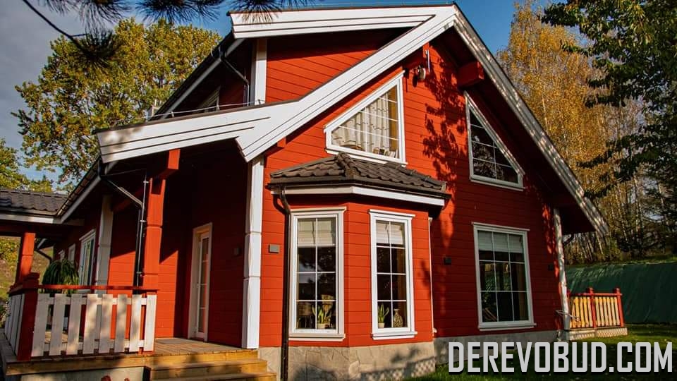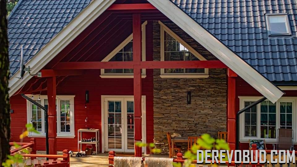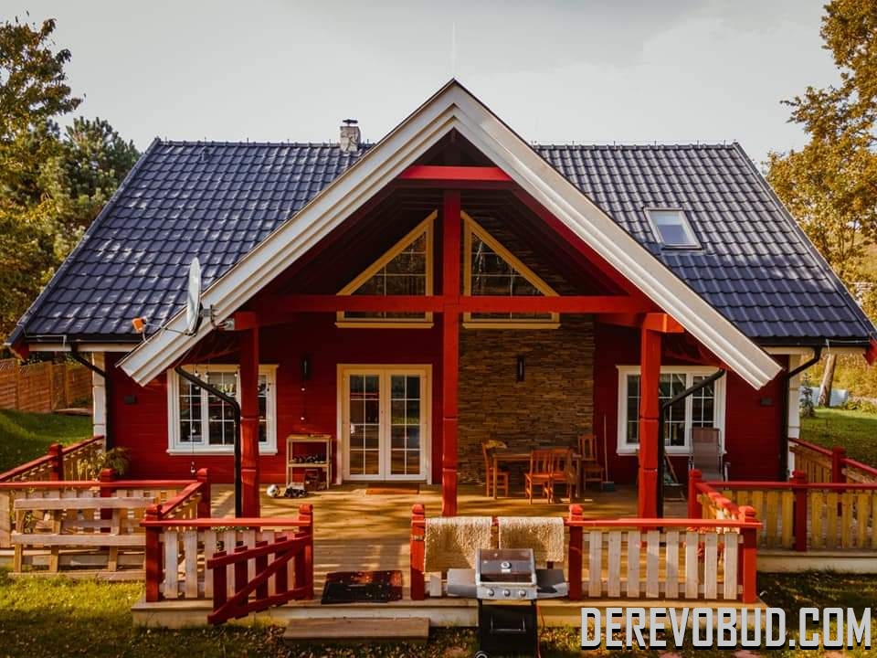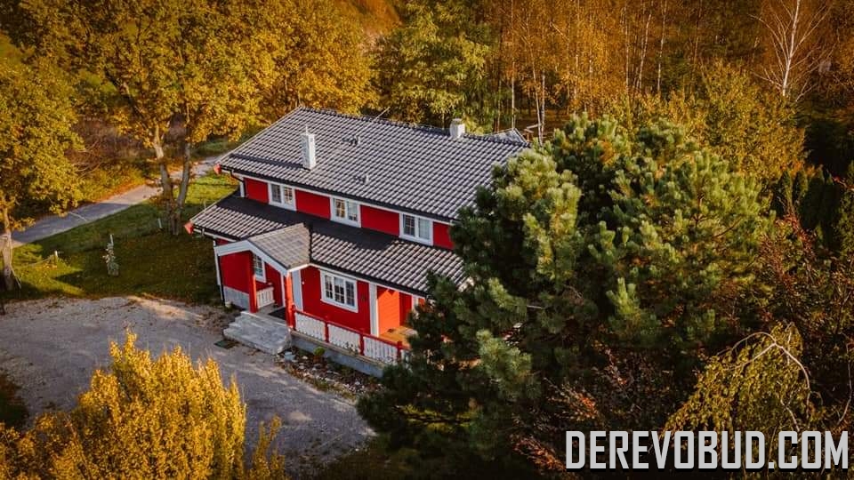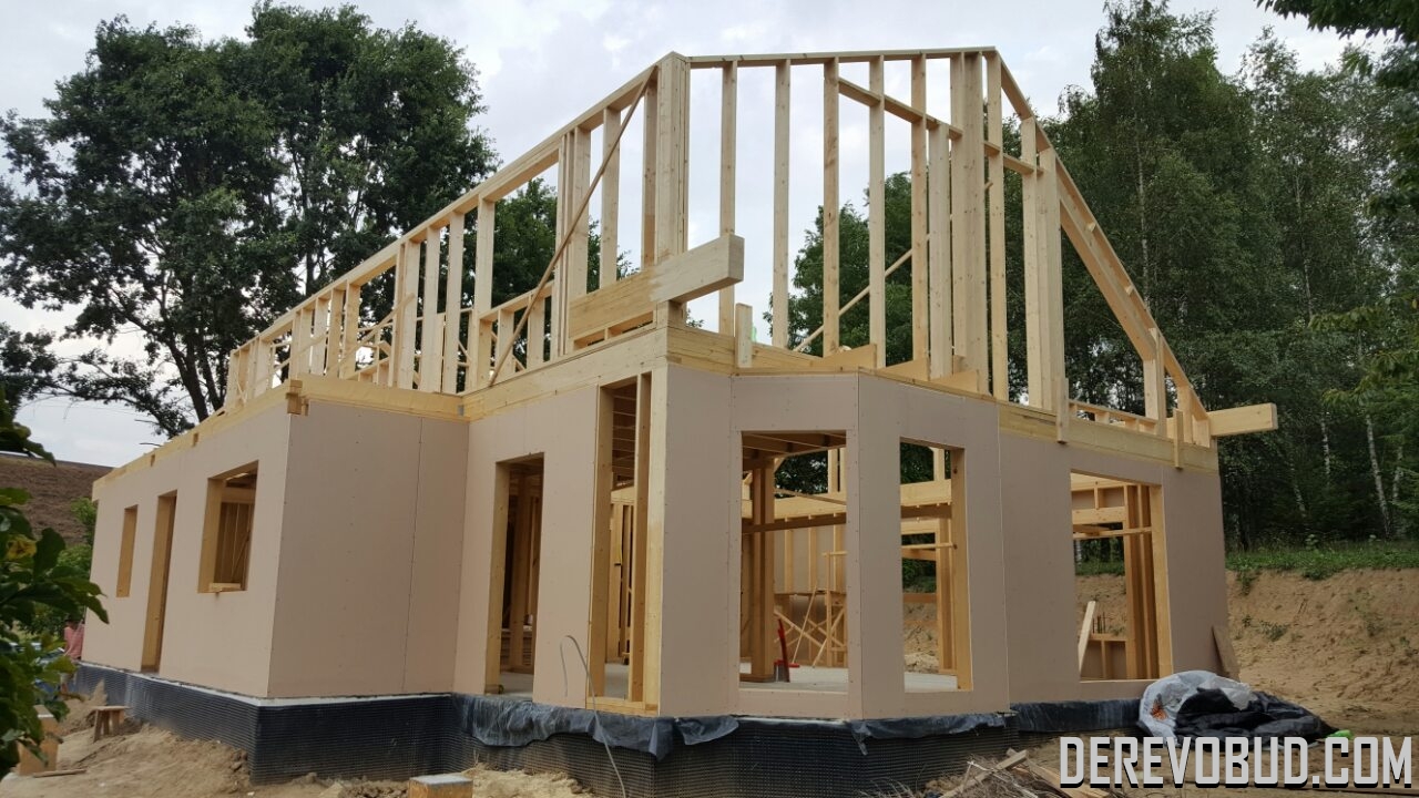 Каркасний будинок пл. 200 м.кв у Польщі Дерев'яний будинок з каркасу по "канадській технології" загальною площею 200 м.кв. збудований у Польщі. Товщина стіни каркасного будинку близько 250 мм забезпечує дерев'яному будинку теплозбереження та шумоізоляцію для комфортного проживання.